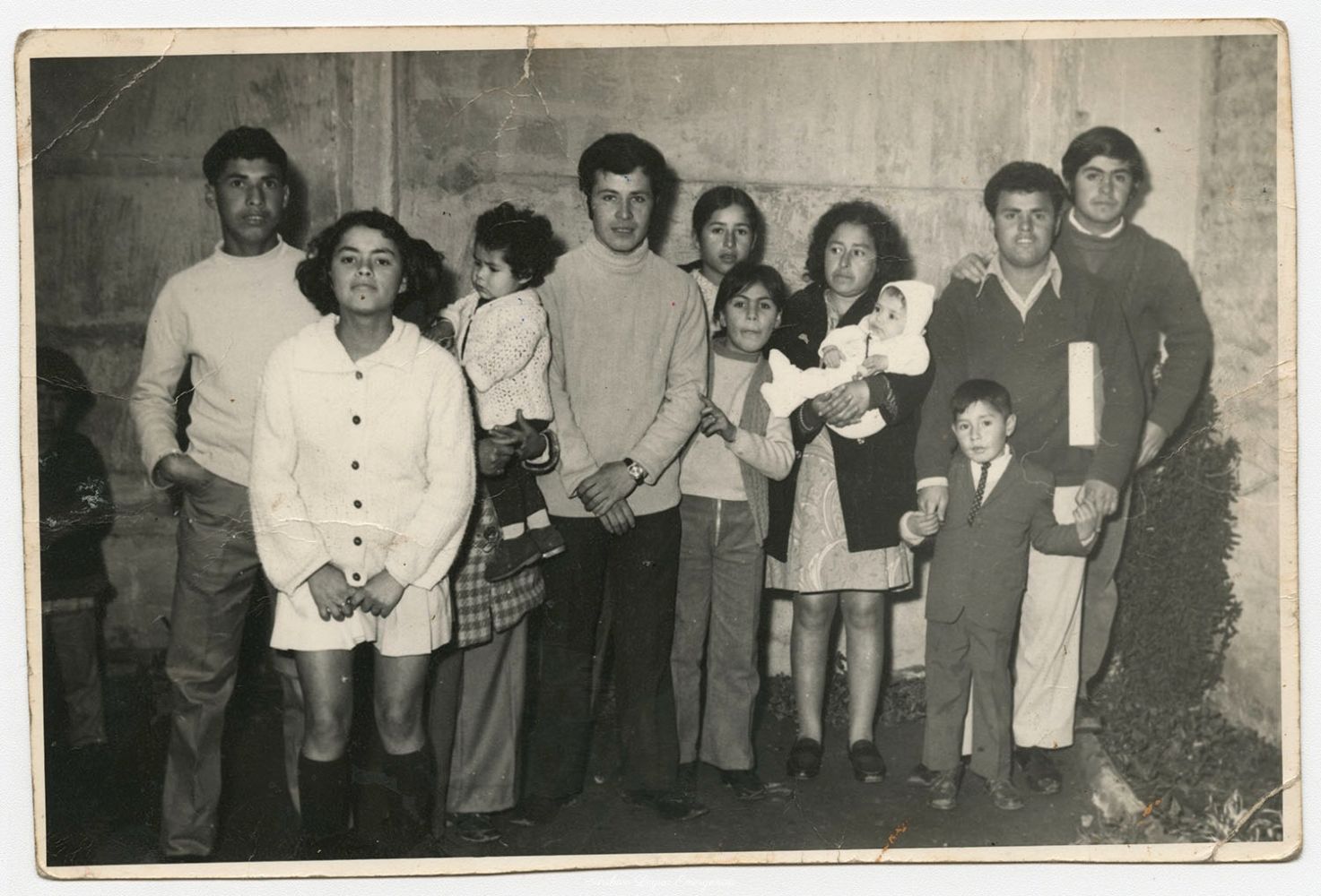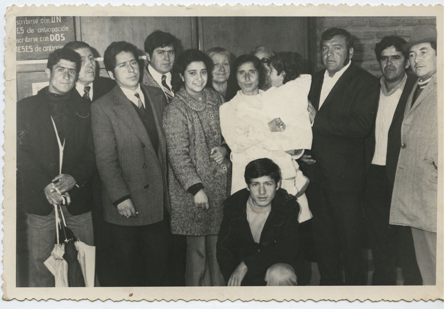 • Familiares acompañando a Tomás Durán en su bautizo, en patio de la Capilla Nuestra Señora de la Paz. En la imagen: Teresa Encina Espinoza, Carlos Encina, Susana Duran, Carmen Encina, Tomás Duran, Jeanette Escobar, Mina Leiva, Tomas Duran y Juana Leiva, Nano Leiva, Pedro Encina y Lucho. La Legua.