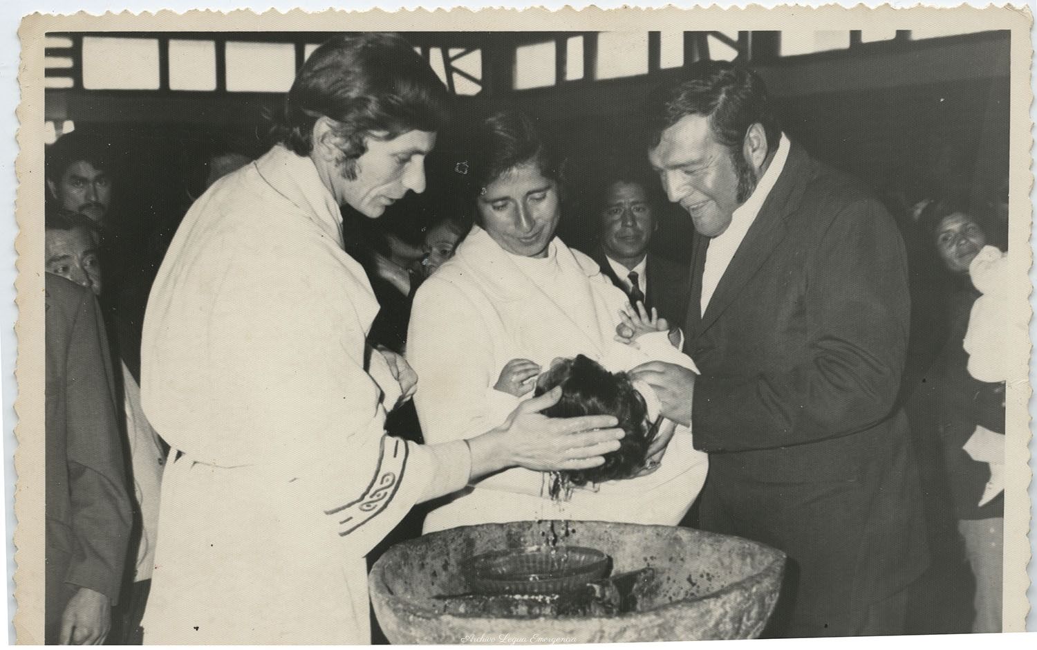• Imagen del bautizo de Marcela Santibañez, realizado por el padre Guido Petters. En la imagen Jorge Lara Sandoval y Regina Santibañez. Parroquia San Cayetano. año 1973.