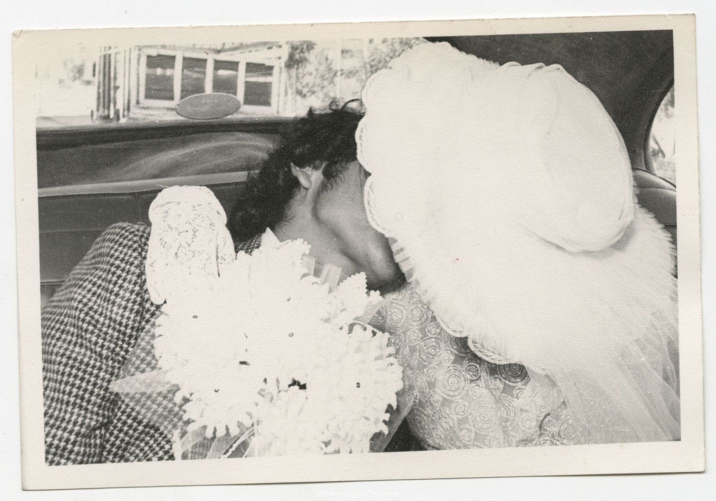 • Humberto Espinoza y Fanny Gonzalez besandose al interior de un automovil, luego de haber contraido matrimonio. 12 de diciembre de 1975