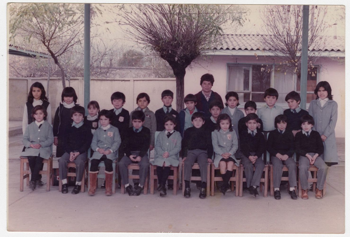 • En la imagen José Luis Espinoza el segundo sentado a la izquierda de la profesora (derecha de la imagen) Fotografia del 4° año básico 1985. La Legua, Colegio localizado en calle San Gregorio.
