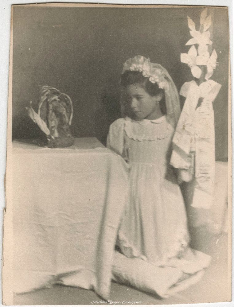 • Gabriela del Carmen Rosales Ponce en su primera comunión aproximadamente ocho años. Fotografía tomada en el colegio. Año aproximado 1957.