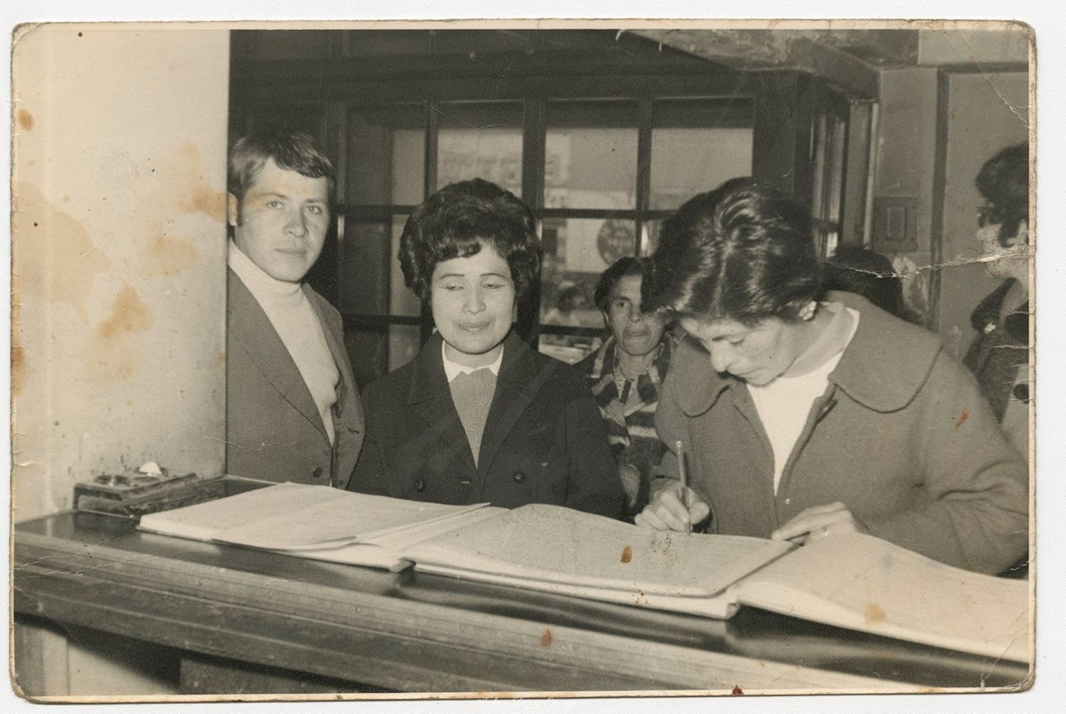 En la imagen Carmen Encina y Tomás Duran contrayendo matrimonio civíl, en la oficina del registro civíl de calle Isabel Riquelme. Carmen Ferrada firmando el acta de matrimonio como testigo. Atras está la madre de Carmen Encina la señora Rosa Espinoza. 29 de agosto de 1969.Encina_Espinoza Encina_EspinozaDate: December 15th, 2020