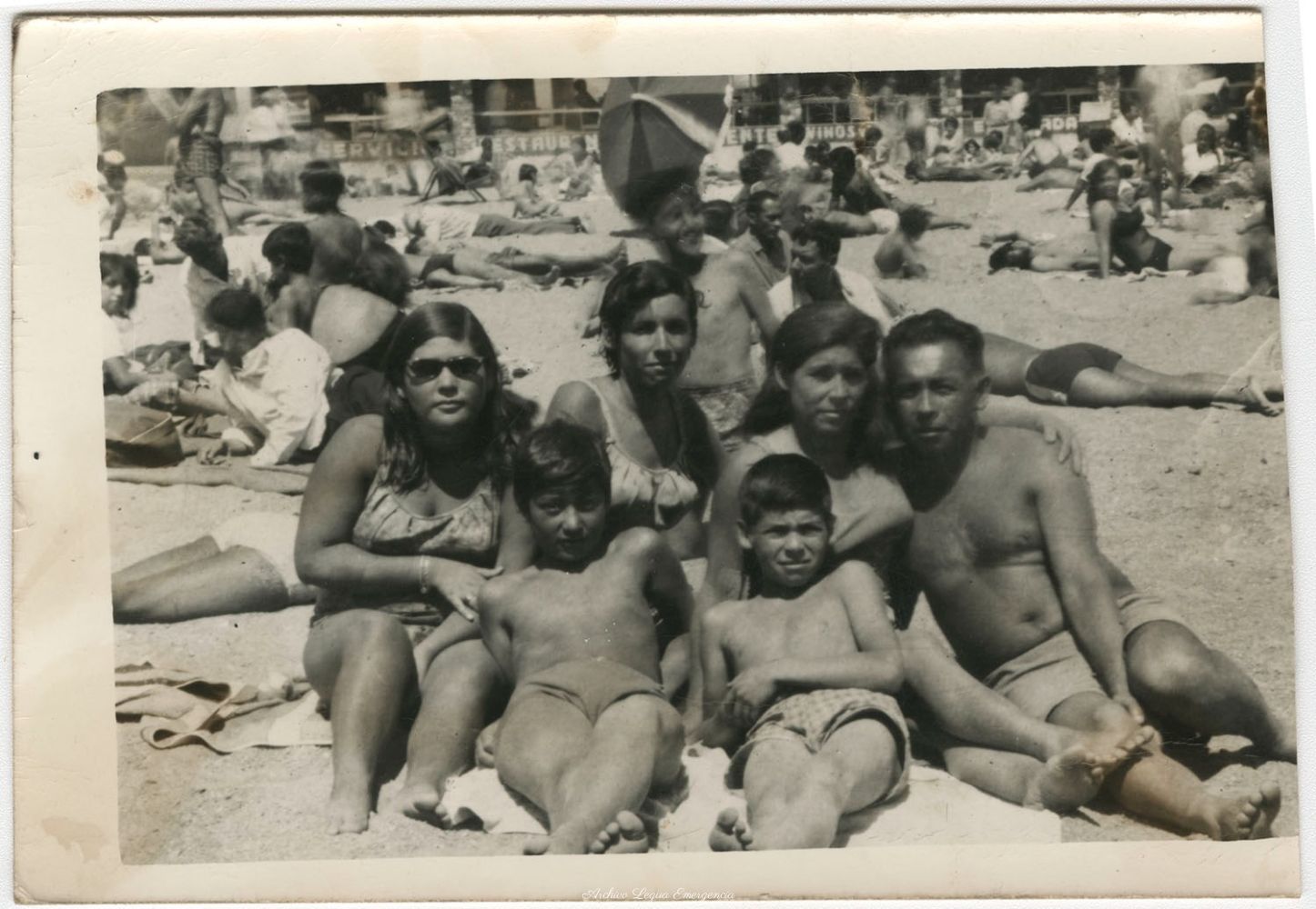 • Viaje por el día a la playa de Cartagena, organizado por la empresa constructora Desco En la imagen: 1 Nanci Acuña Morales. 2 Gabriela Rosales Ponce. 3 Yolanda Ponce Aliaga. 4 Gabriel Rosales Bustos. 5 Juan Rosales Ponce. 6 Eduardo Rosales Ponce. Década de los 70.