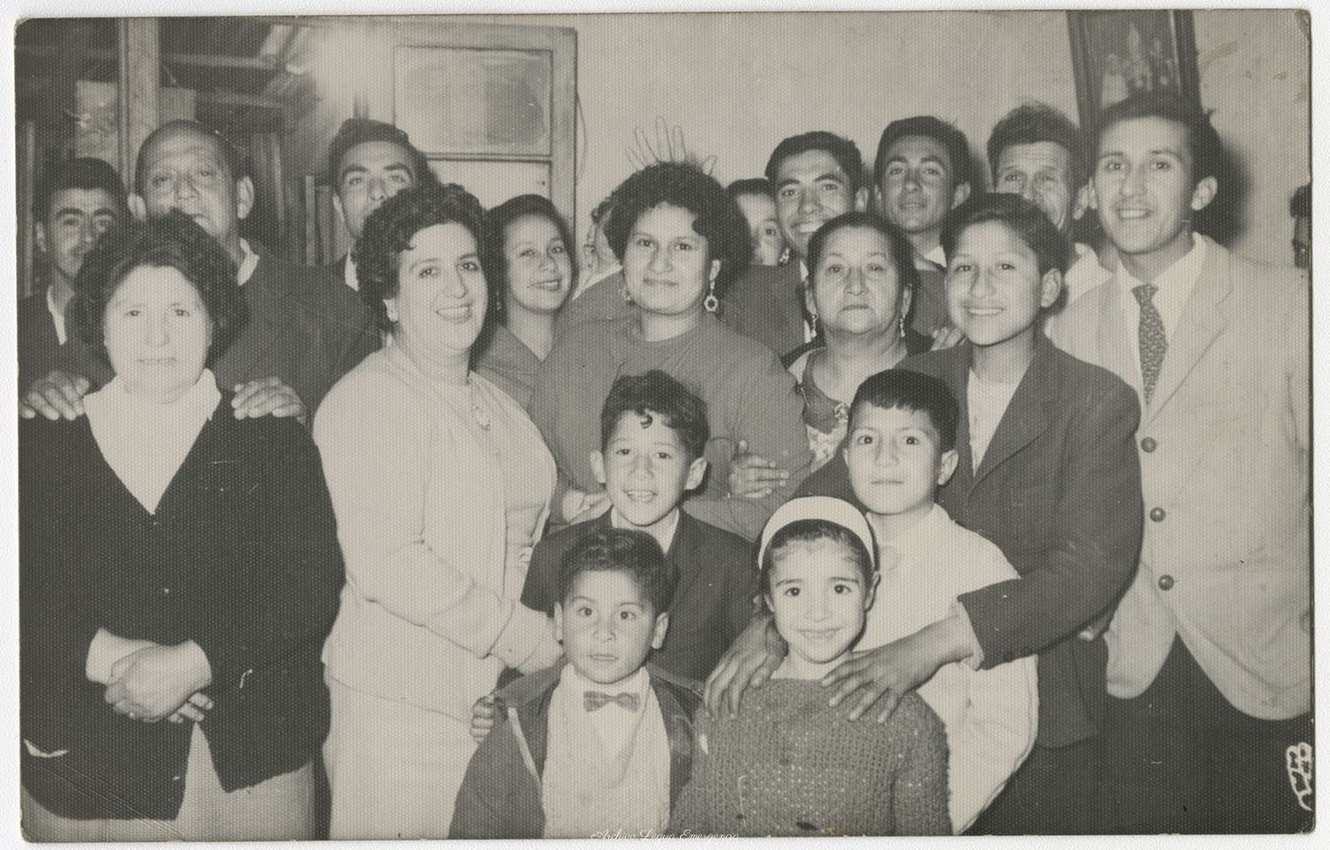 • Inés Flores junto a sus familiares y vecinos en su casa de J. Canning 613. Década del60.